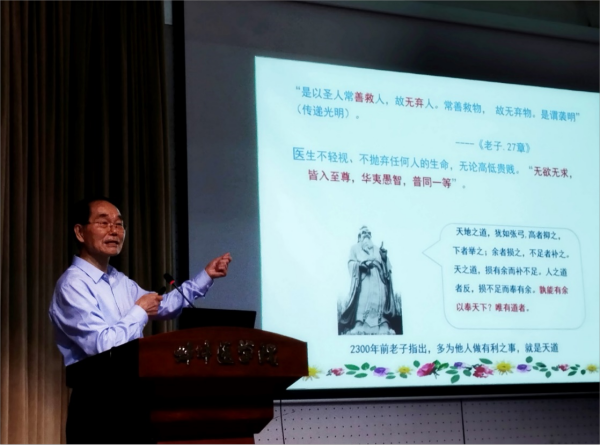 沈继龙教授作了题为“传承优秀中华文化 弘扬医学人文精神”的专题讲座。沈教授从优秀传统文化与医生和教师的初心和使命为起点,通过对新医学模式与新医患关系的解读,追问什么是医学人文精神,向蚌医莘莘学子娓娓讲述了传统文化中的医学人文精神,勉励师生追求先贤的医道和人道,躬行人文修身,仁术治病和仁心育人,终成大道。