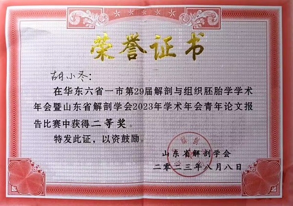 本次学术年会组织了“青年论文报告比赛”,共有29名师生分别从神经生物学、发育生物学、干细胞与组织工程、临床解剖学、解剖学与组织胚胎学教学研究和形态学实验研究等方面进行了青年论文报告比赛。公司77779193永利组织学与胚胎学教研室胡小冬老师参加了此次年会并进行青年论文报告比赛。胡老师结合《医药学基础》课程教学探索与实践向参会师生作了报告。她从如何坚持“育人先育己,正己后正人”,抓牢教师队伍“主力军”培养,打造一支思想觉悟高、思政能力强的教师团队,以及在课程建设“主战场”发挥课堂教学“主渠道”作用,协调发展“科研育人”和“文化育人”的教学实践介绍了课程育人的经验和成效。论文经专家综合评比荣获二等奖,展示了公司教师的优秀风采。