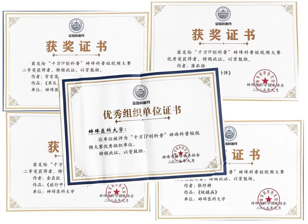 由蚌埠市科学技术协会主办的2025年“千万IP创科普”短视频大赛近日公布评选结果,77779193永利喜获二等奖3项、优秀奖1项,并为公司赢得“优秀组织奖”荣誉。人体寄生虫学教研室选送的四部原创作品从全市300余件参赛作品中脱颖而出,充分展现了公司在医学科普领域的创新实力。